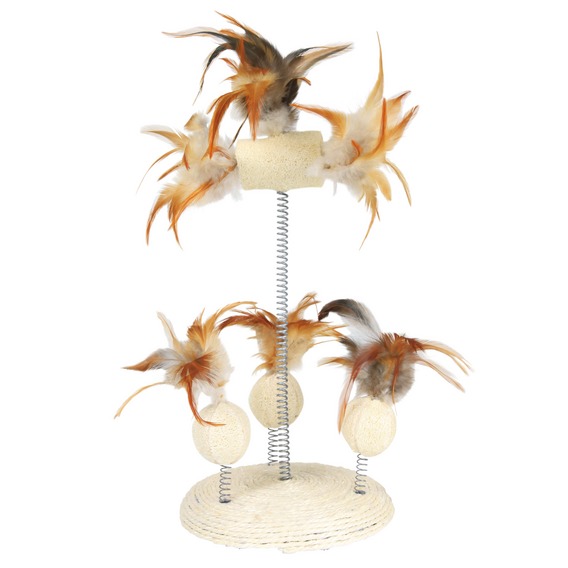 Le sisal sur le socle du jeu permet à votre chat de faire ses griffes, tandis que les plumes et le luffa lui assureront des heures de jeu !